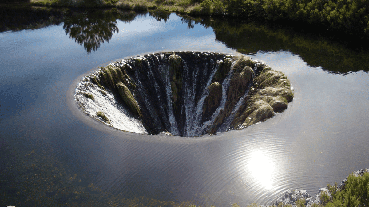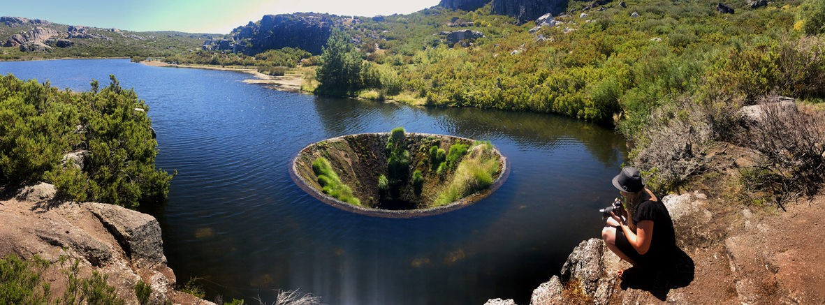 Daniel Alvez và Hélder Tavares là những người thích chơi drone (thiết bị bay không người lái). Đầu năm 2016, trong khi đang điều khiển một drone ở núi Serra da Estrela, họ vô tình quay được cảnh một hồ nước bí ẩn nằm trên núi. Kỳ dị là giữa lòng hồ này lại có một cấu trúc tròn vành vạnh hệt như miệng phễu. Nước từ trong lòng hồ chảy tràn vào nó và biến mất một cách lạ lùng.