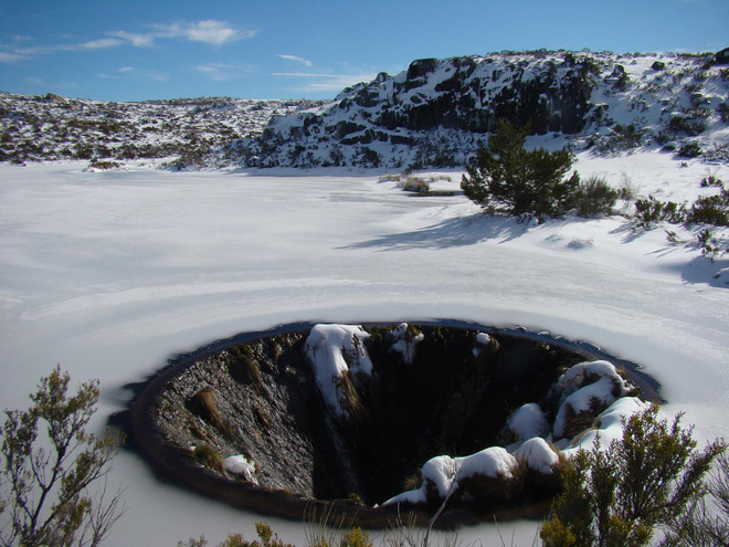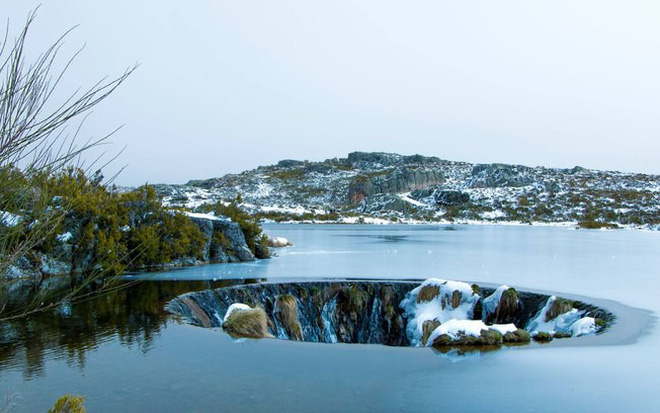 Khi mùa đông đến và mặt nước hồ Laca Serra da Estrela bị đóng băng, cái hố chìm nom hệt như cánh cổng địa ngục này lại càng tăng thêm vẻ thần bí. Cả thác nước đổ xuống lẫn thảm thực vật kiên gan trên thành phễu cũng đều bị đóng băng. Chúng tạo nên như một bức tranh tĩnh đầy mê hoặc.
